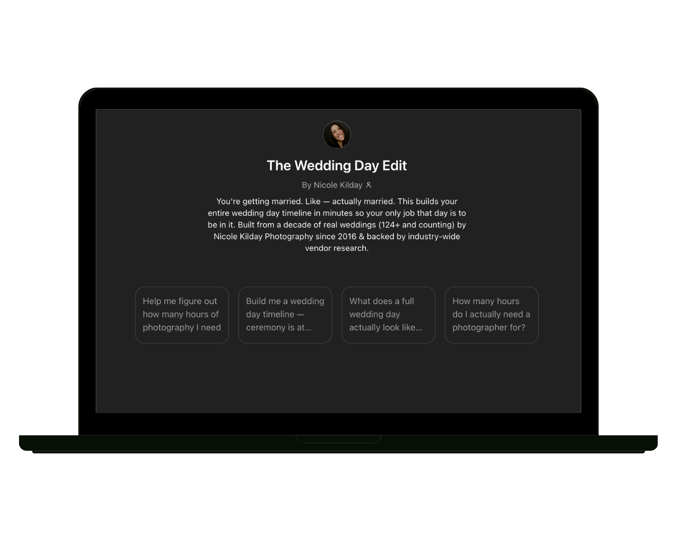 The Wedding Day Edit is a custom AI-powered wedding day timeline builder — built on ChatGPT, backed by a decade of real wedding photography experience.